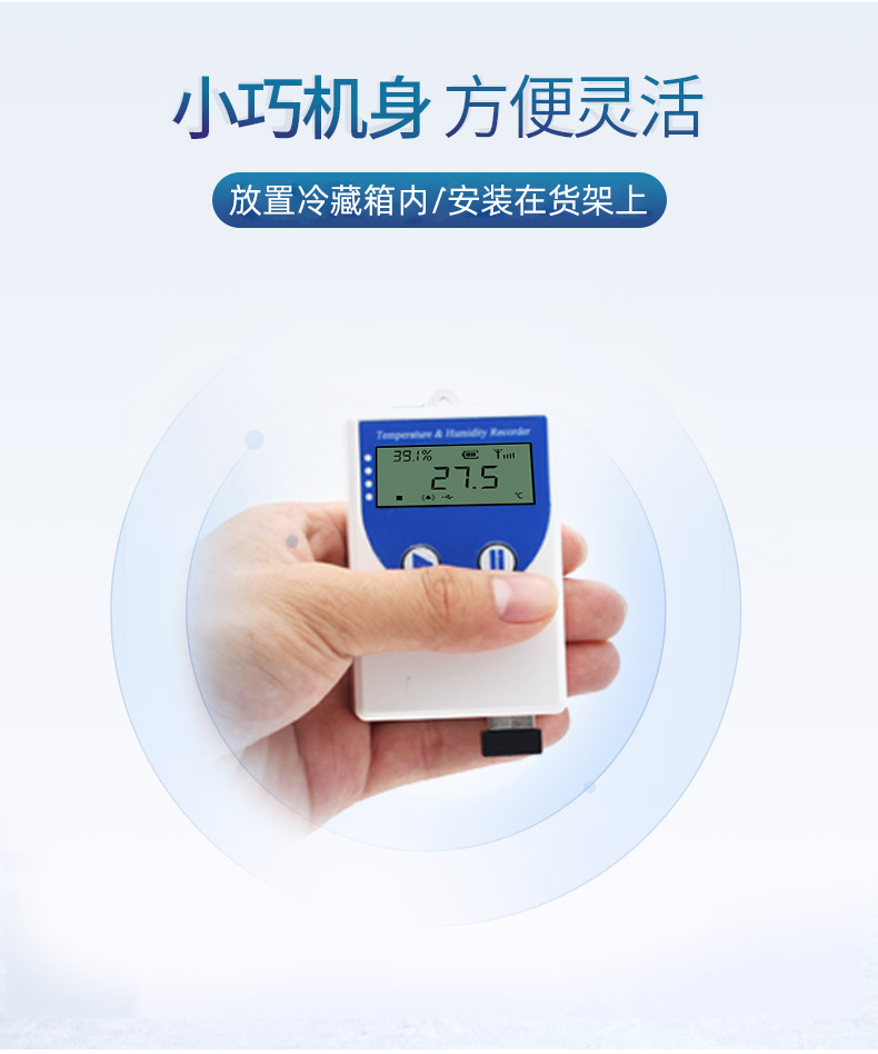 為方便各種場景的使用,智能溫濕度記錄儀分為內置探頭型和外延探頭型,內置探頭型適用于普通環境使用,外延探頭型適合在高濕度的場合使用,探頭線可延長至30m。