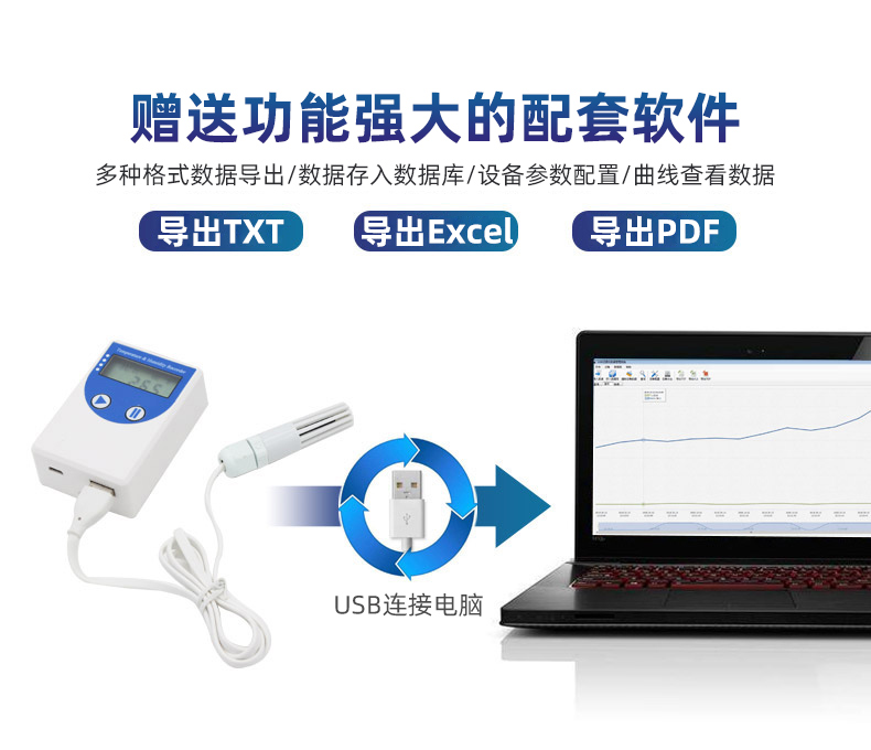到達目的地后,智能溫濕度記錄儀可以通過USB線連接電腦,配合配套的軟件可以將設備中已存儲的數據以EXCEL/TXT/PDF等格式導出到電腦,以供接收方查看運輸過程中的數據,方便后續報表制作及數據分析。