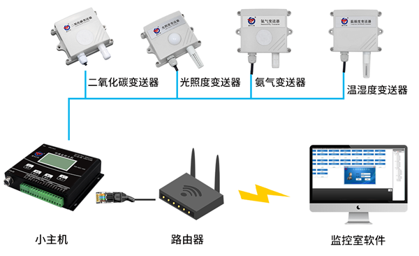 環境監控主機RS-XZJ-100-Y能夠掛接32臺養殖場內安裝的485型變送器,通過GPRS/4G無線或485、以太網有線方式,將前端傳感器采集的數據傳輸到環境監控平臺。